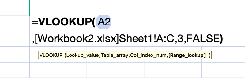 =VLOOKUP(A2, '[C:\Users\YourName\Documents\Workbook2.xlsx]Sheet1'!A:C, 3, FALSE)