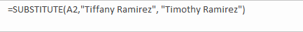 Formula is written as: =SUBSTITUTE(TEXT_COLUMN, OLD_TEXT, NEW_TEXT)