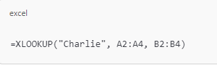 Charlie is the lookup value, A2:A4 is the lookup array, while B2:B4 is the return array.