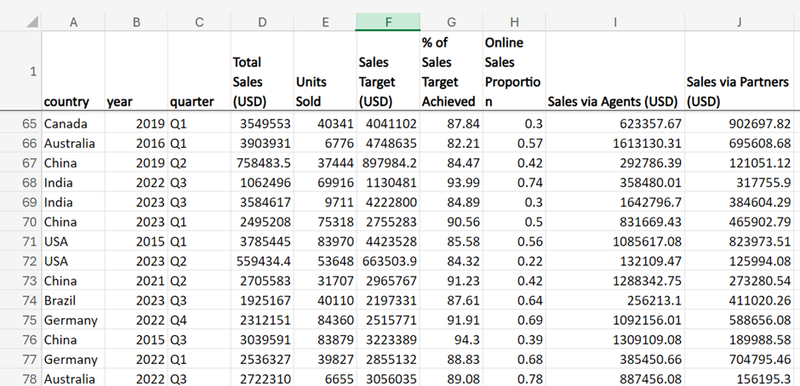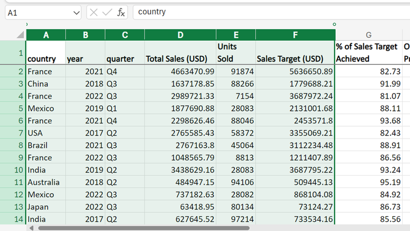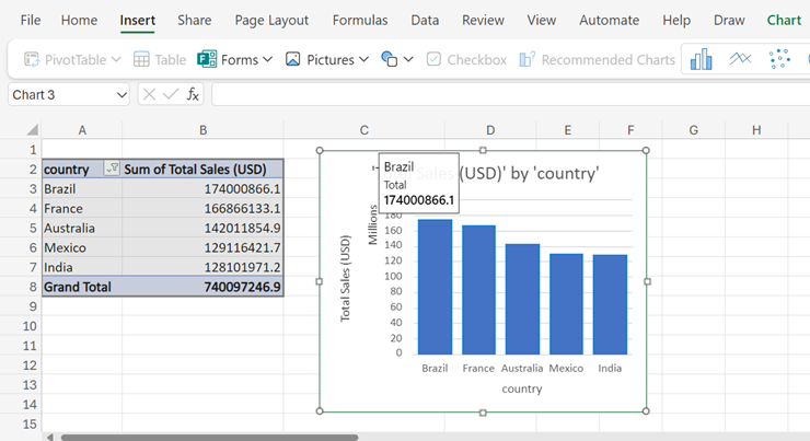 - Based on the task, we’d be working with the “country” and “Total Sales (USD)” variables as shown below. The checked variables are immediately displayed on the left. By default, the Spreadsheet summarizes values by calculating sum for similar groups as seen in column B title.