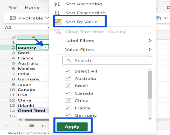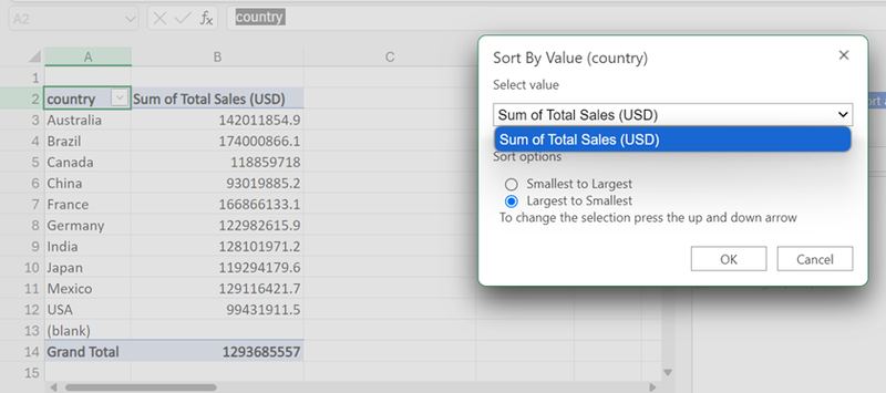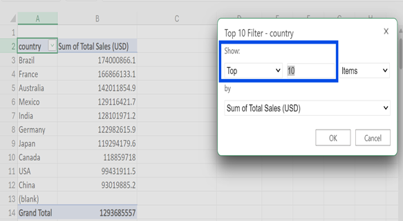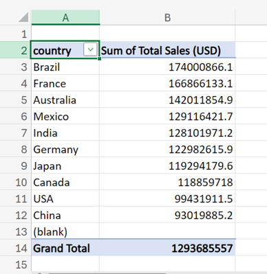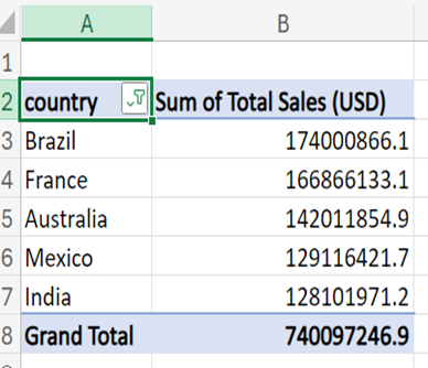 - Next is to sort the table in descending order by “Column B” to reveal the top 5 countries with the highest total sales.