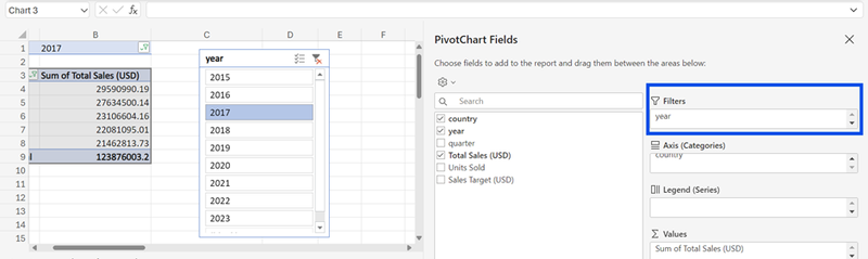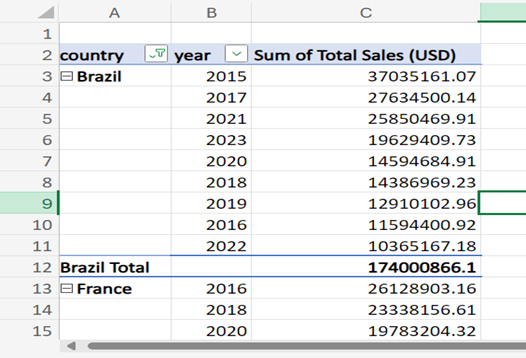 - We can also add a subcategory, year, to the pivot table. This gives us the sum of total sales across the years for each country.