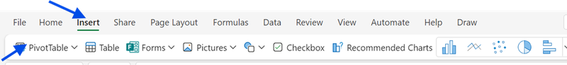 - Click on insert in the ribbon options and select Pivot Table.